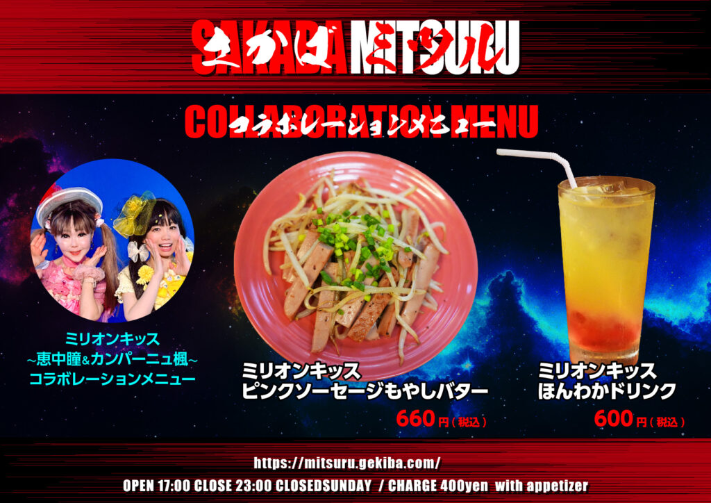 魅力あふれるミリオンキッス様とのコラボメニューが始まります! ●ピンクソーセージもやしバター ●ほんわかドリンク 是非ご注文よろしくお願いいたします♪