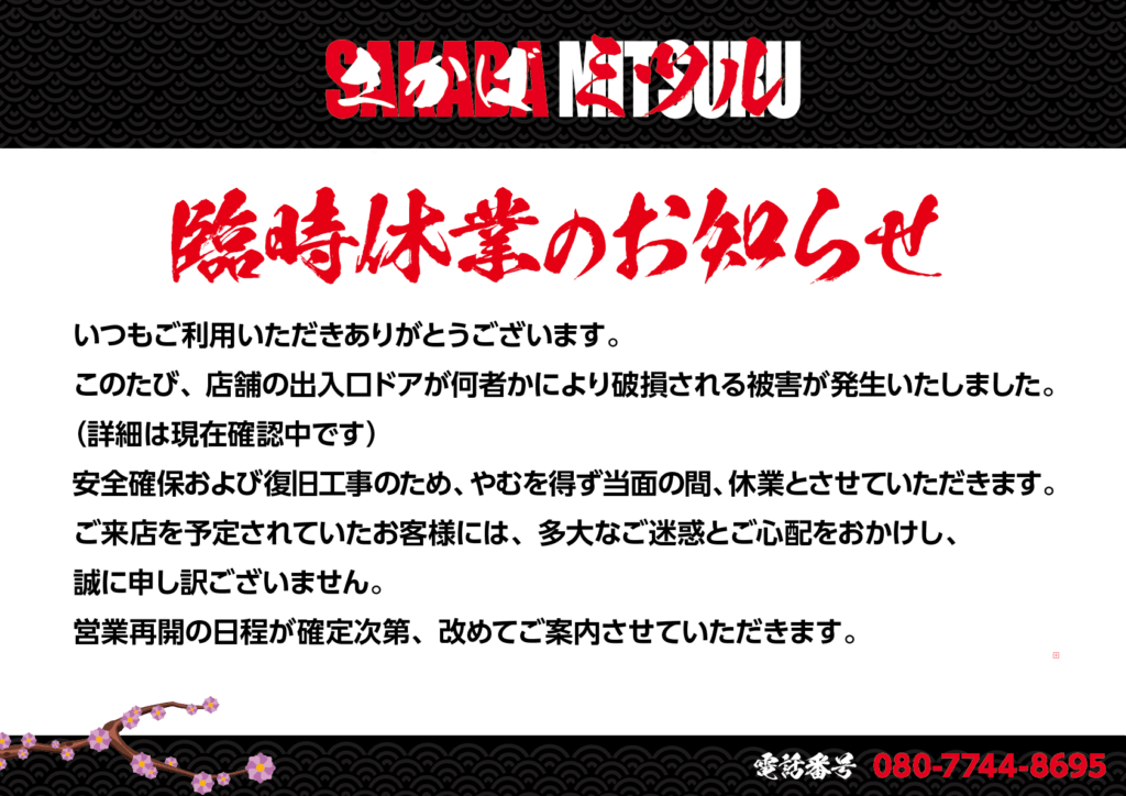 臨時休業のお知らせいつもご利用いただきありがとうございます。 このたび、店舗の出入口ドアが何者かにより破損される被害が発生いたしました。(詳細は現在確認中です) 安全確保および復旧工事のため、やむを得ず当面の間、休業とさせていただきます。 […]