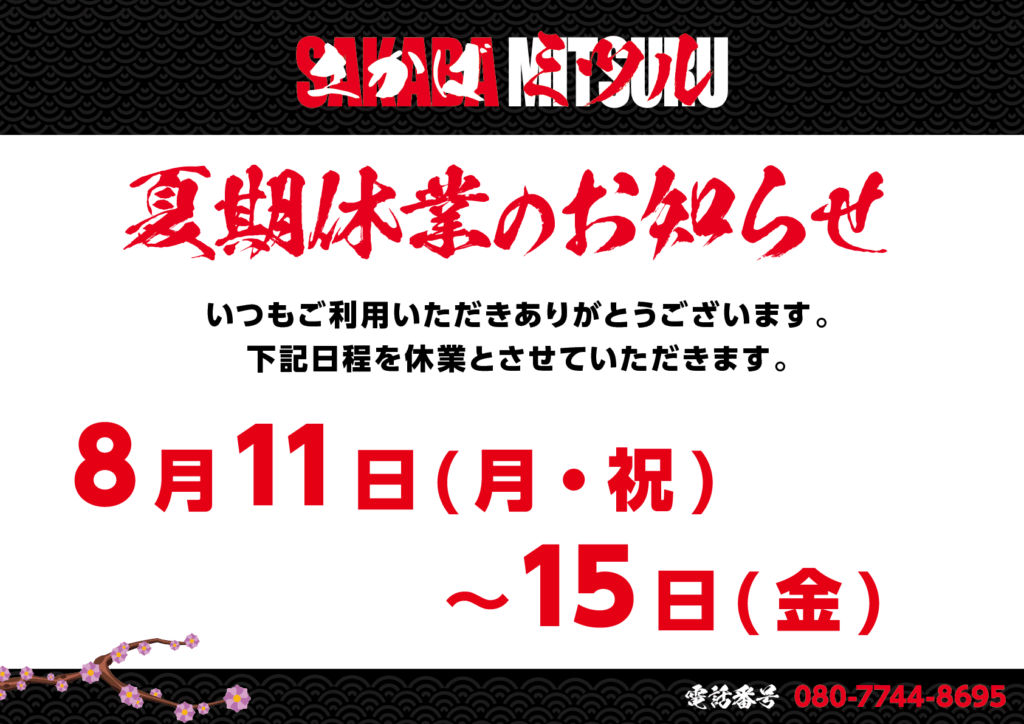 8/11(月・祝)~15(金)夏季休業のお知らせ夏季休業のお知らせ 平素は格別のご愛顧を賜り、厚くお礼申し上げます。 誠に勝手ながら、下記の期間を夏季休業とさせていただきます。 8/11(月・祝)~15(金)